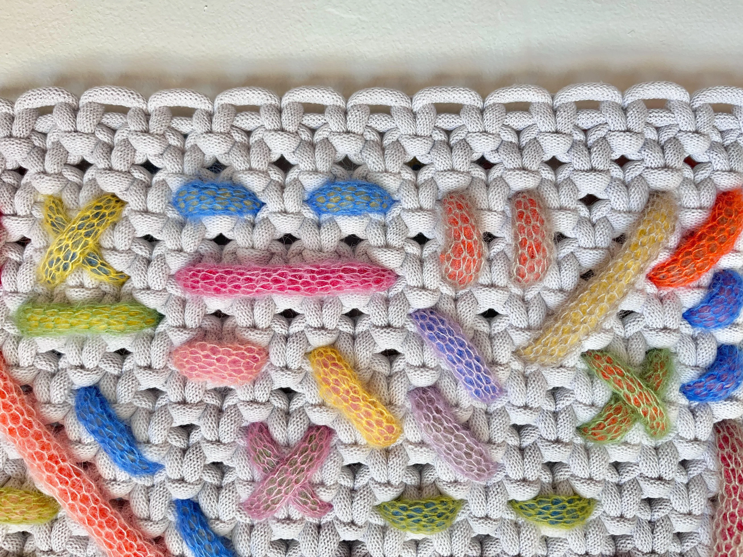 I knit vibrant, airy cord layered in color and woven into knotted grey canvases. When the mohair catches the light, it creates a soft glow. The creation of each work is intuitive. Each knitted piece is subject to be unraveled until it’s paired with the right color and laid in a way that feels balanced within the piece.